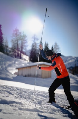 Gut gestärkt und voll motiviert starteten wir bei Kaiserwetter zu unserem Übungsgelände. Ziel war es nun durch praktische Übungen den richtigen Umgang mit der Notfallausrüstung (LVS-Gerät, Schaufel & Sonde) zu lernen und vor allem zu üben. Es wurden von jedem Teilnehmer einzeln verschiedene Szenarien, von der Einfachverschüttung bis hin zur Mehrfachverschüttung, mit Sondieren und Ausschaufeln durchgespielt.