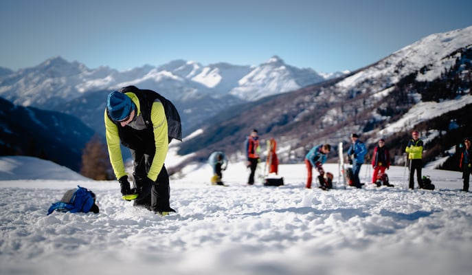 Realistisch gesehen bleiben bei einer Lawinenverschüttung maximal 15 Minuten für eine Bergung mit Überlebenschance. Somit bietet fast ausschließlich die Kameradenrettung Aussicht auf eine wirkliche Hilfe bei einer Totalverschüttung.
